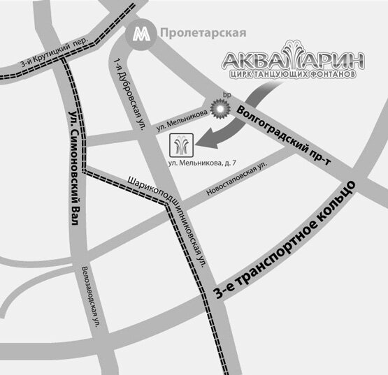 | Проезд: станция метро “Пролетарская" (1-й вагон из центра, в подземном переходе - первый выход направо), пройти 750 метров по ул. 1-я Дубровская (смотрите схему). Также возможно проехать на общественном транспорте (выходить через одну остановку). |